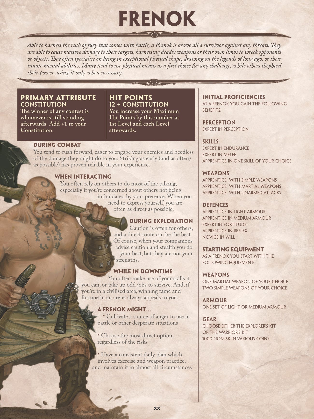 With Ancestries and Backgrounds done, the next item in alphabetical (and development) order are the Classes. The two martial classes (Frenok and Thanator) are up first. There’s still some finalisation to be done, but the invocation classes will need a big list of invocations for them to be fully analysed, so these two are first on the docket.